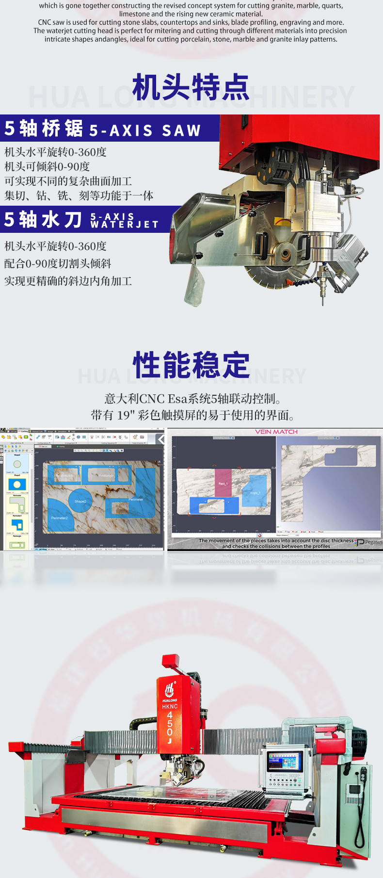 with top of the line Italian CNC control system ESA, is a fully automated dual-use machine, a combination of a 5-axis CNC saw and a 5-axis CNC waterjet, which is gone together constructing the revised concept system for cutting granite, marble, quarts, limestone and the rising new ceramic material.